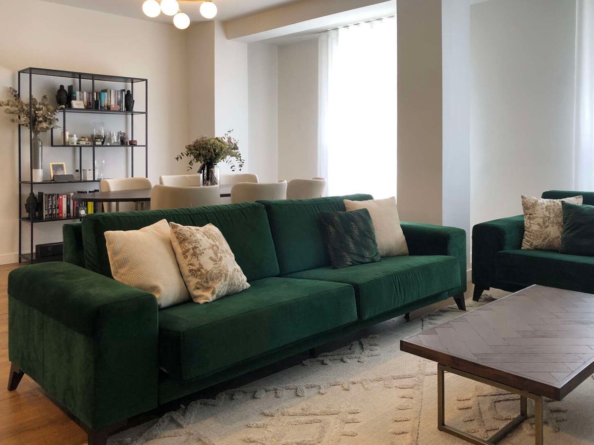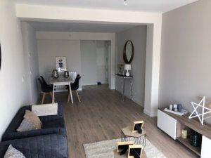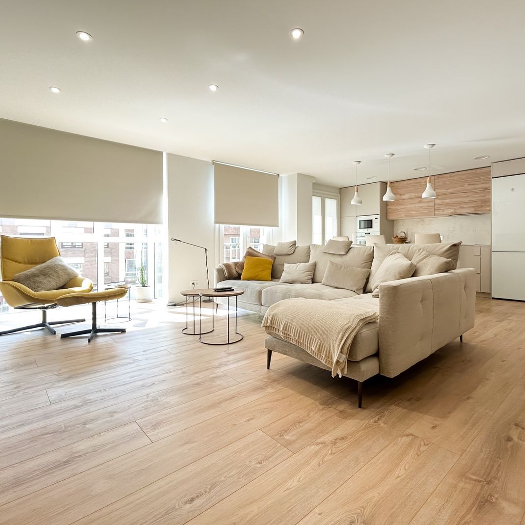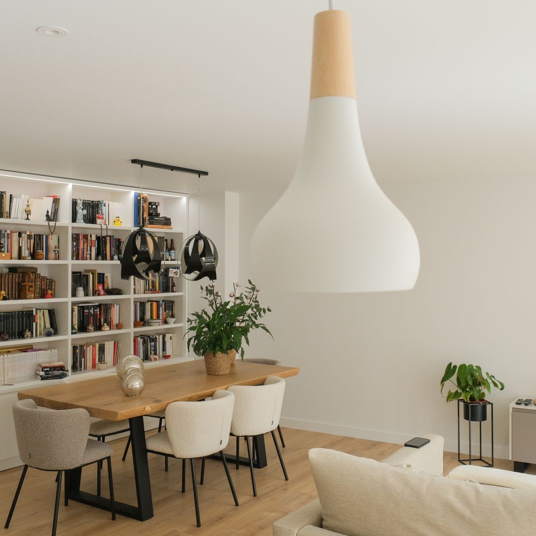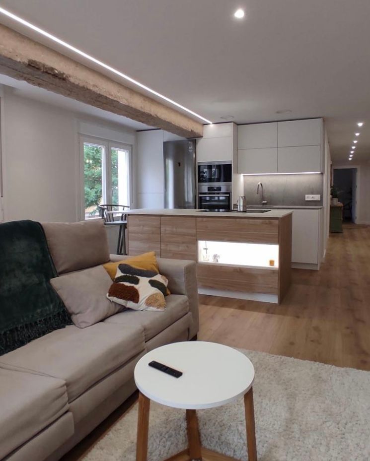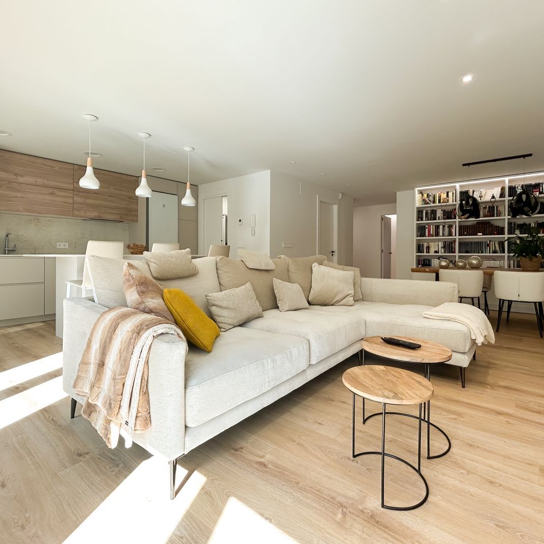 Nos encontramos con una vivienda que respira frescura en cada rincón. Se podría decir que con la actuación realizada hemos conseguido dividir la vivienda en dos únicas estancias, pese a disponer de mas de 100m2, pero así de esta forma logramos que la amplitud sea la principal característica que las defina.