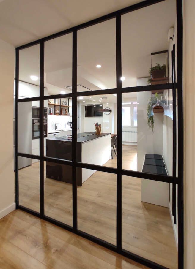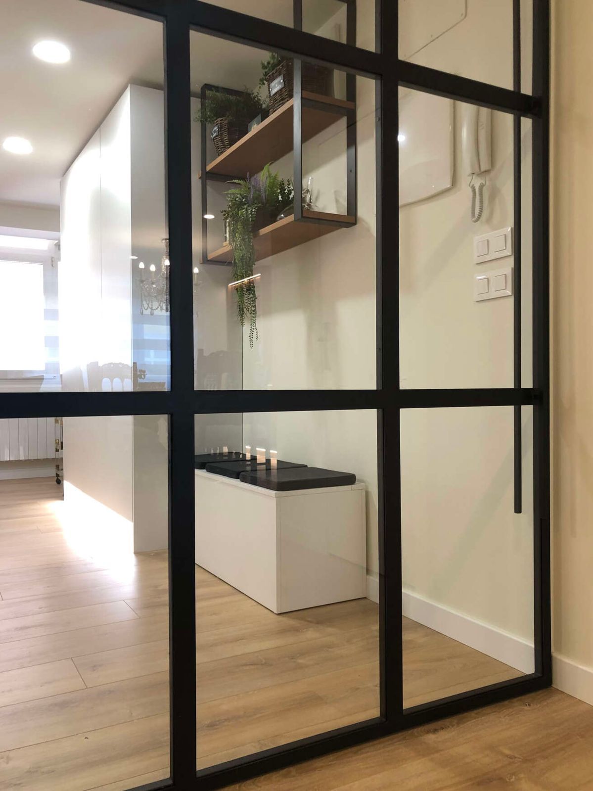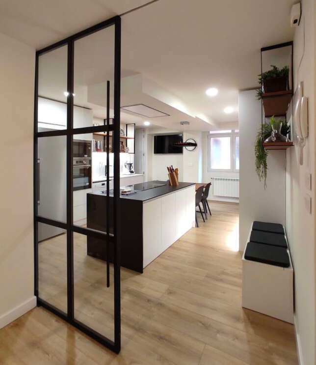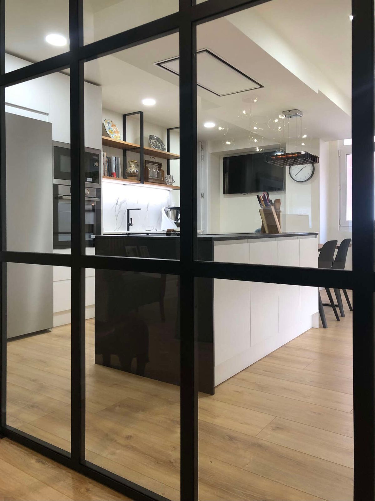 Otro de los recursos utilizados para potenciar lo anteriormente comentado fue a través de la integración de espacios, ya sea mediante el vestidor unificado con el dormitorio o la fantástica puerta corredera de hierro y vidrio de más de 2 metros que separa la cocina del salón- comedor.