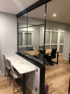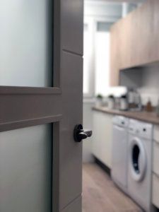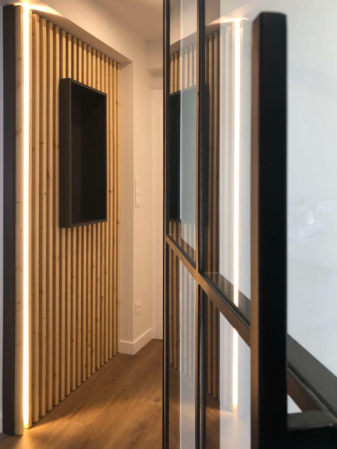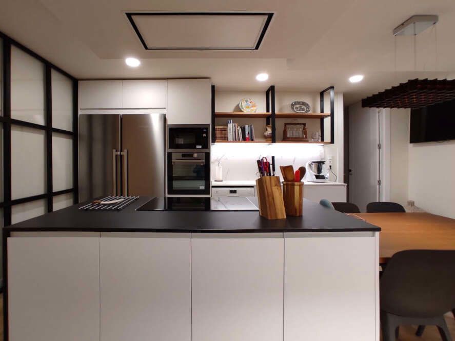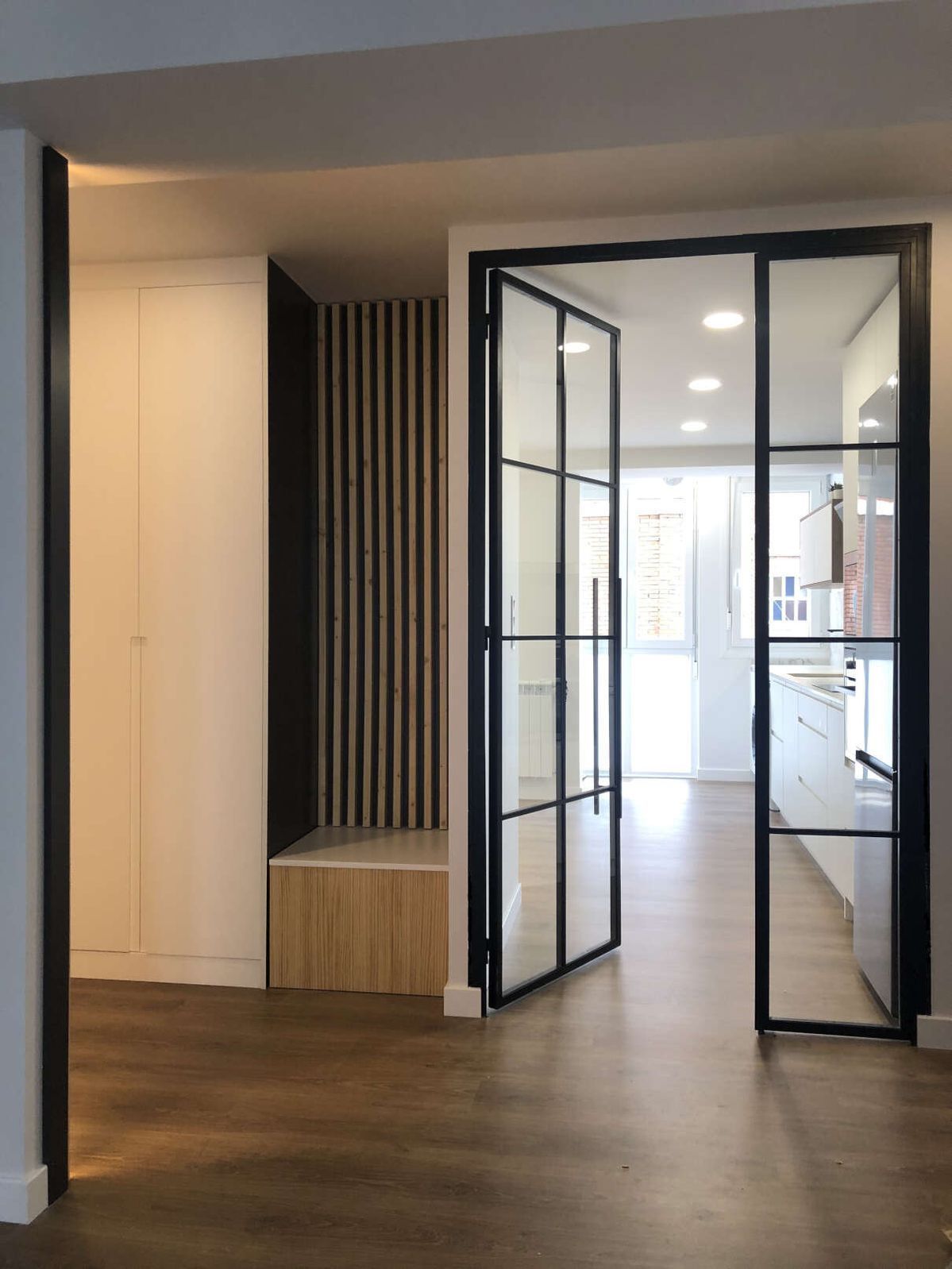 Otro de los recursos utilizados para potenciar lo anteriormente comentado fue a través de la integración de espacios, ya sea mediante el vestidor unificado con el dormitorio o la fantástica puerta corredera de hierro y vidrio de más de 2 metros que separa la cocina del salón- comedor.