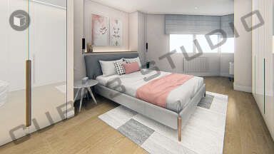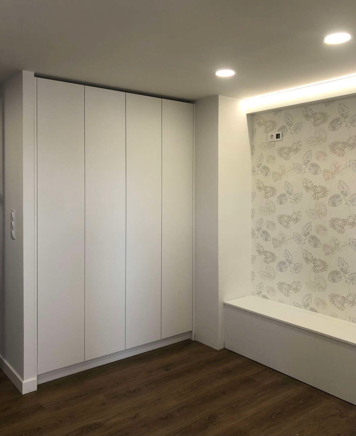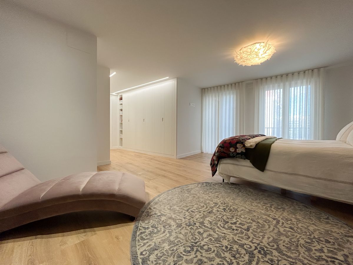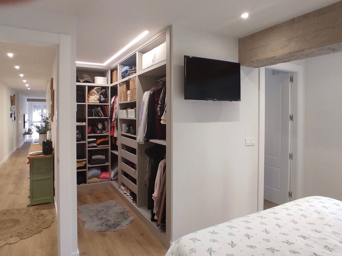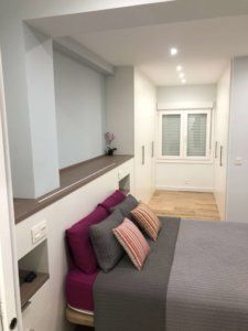 Por otro lado, el único dormitorio de la vivienda dispone de un gran vestidor y una zona de despacho en la que insistiendo en el concepto de integración de espacios conseguimos que nos quede una amplia estancia, dejando el baño principal en la zona más oscura, igual que hemos comentado anteriormente.
