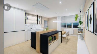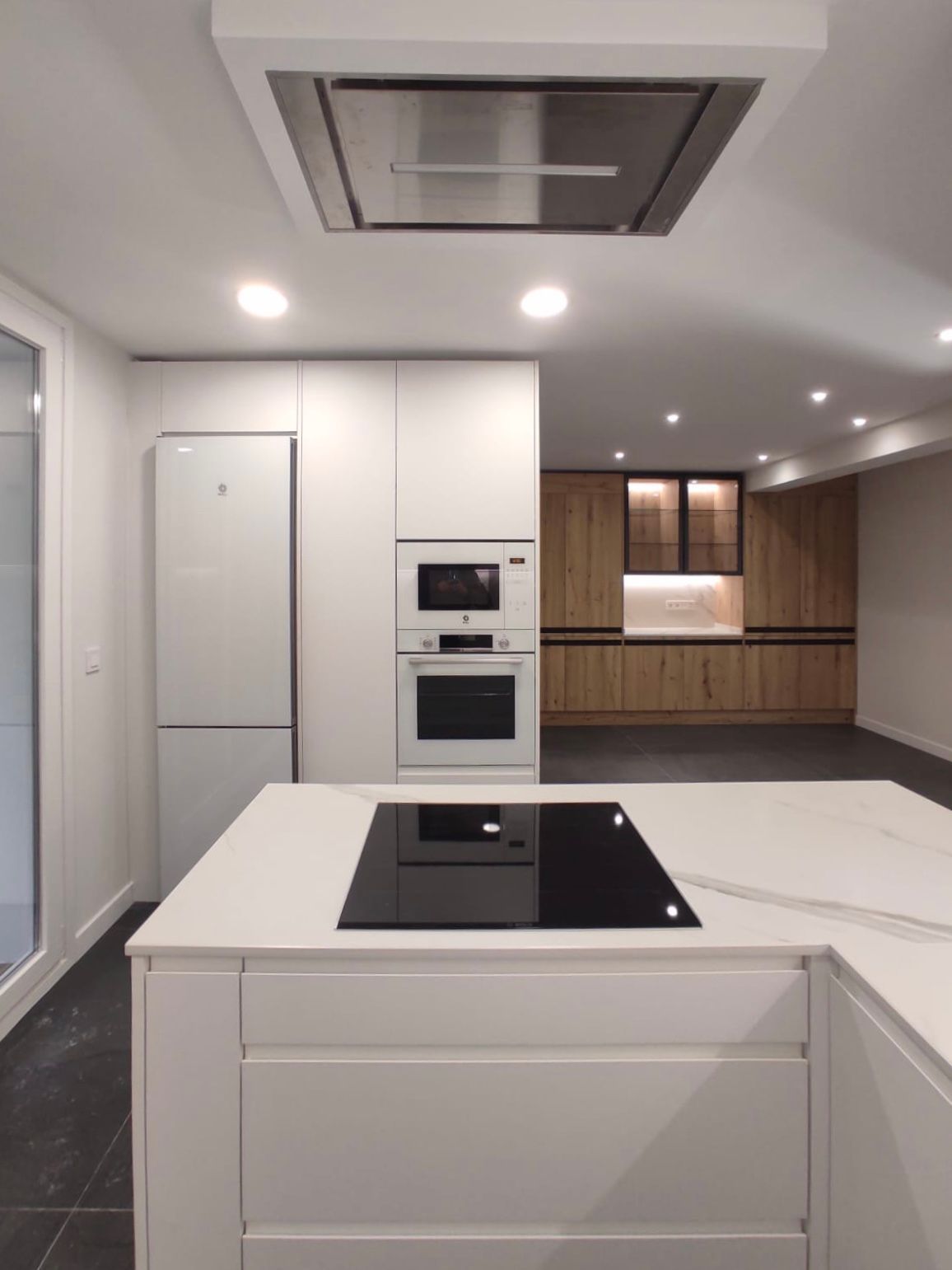 En el resto de la vivienda continuamos con la misma tónica, quedando bien reflejado en la gran cocina con el comedor adherido a ella, dando como resultado un gran espacio práctico y funcional.