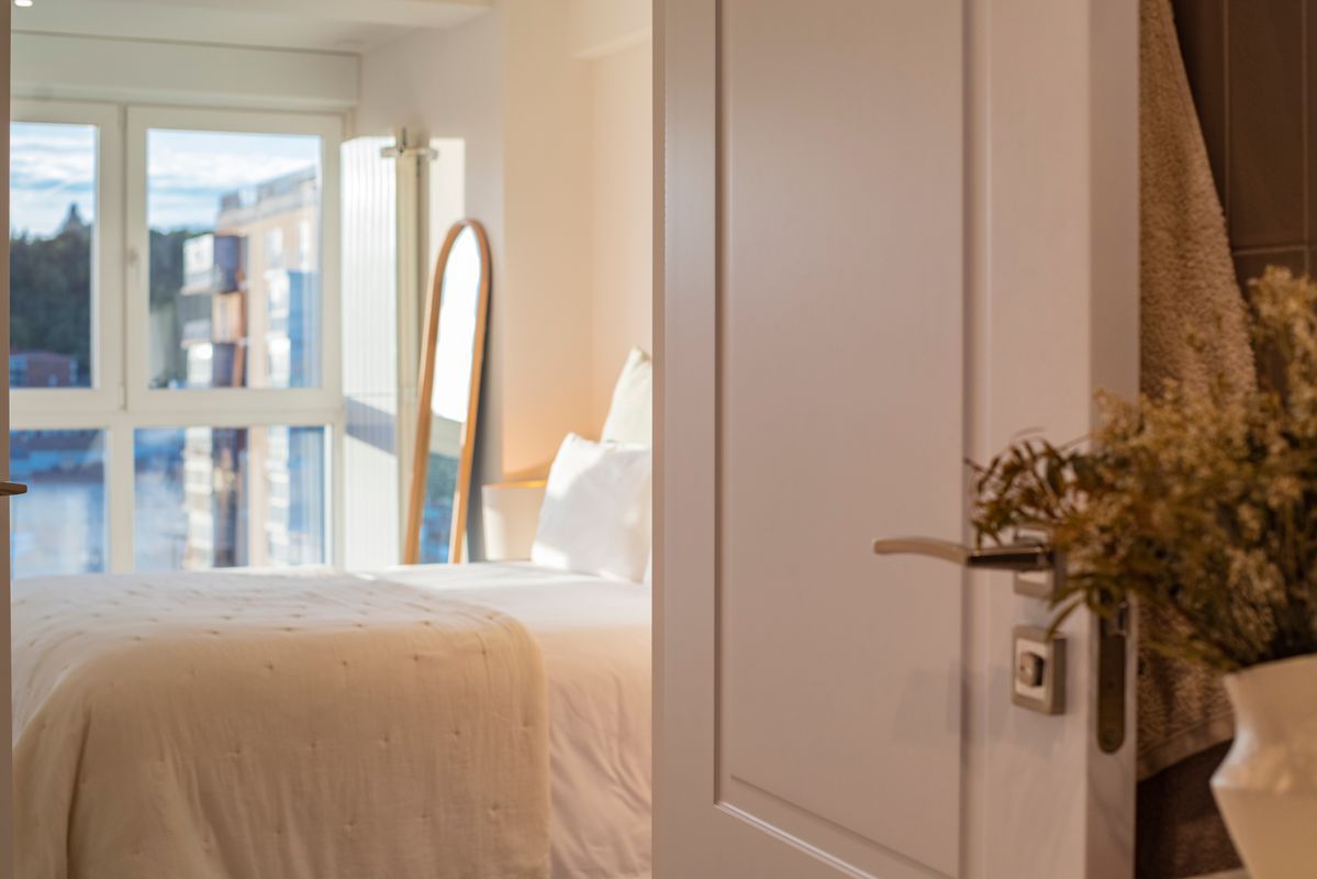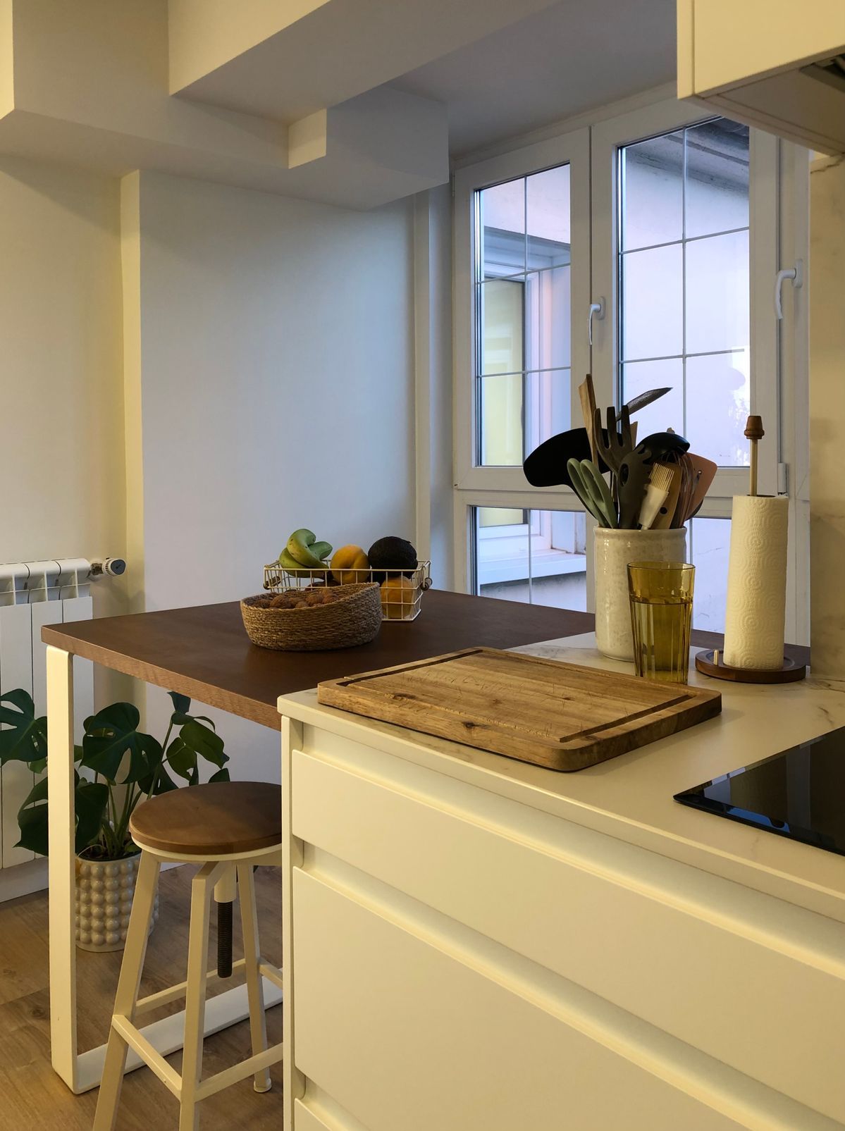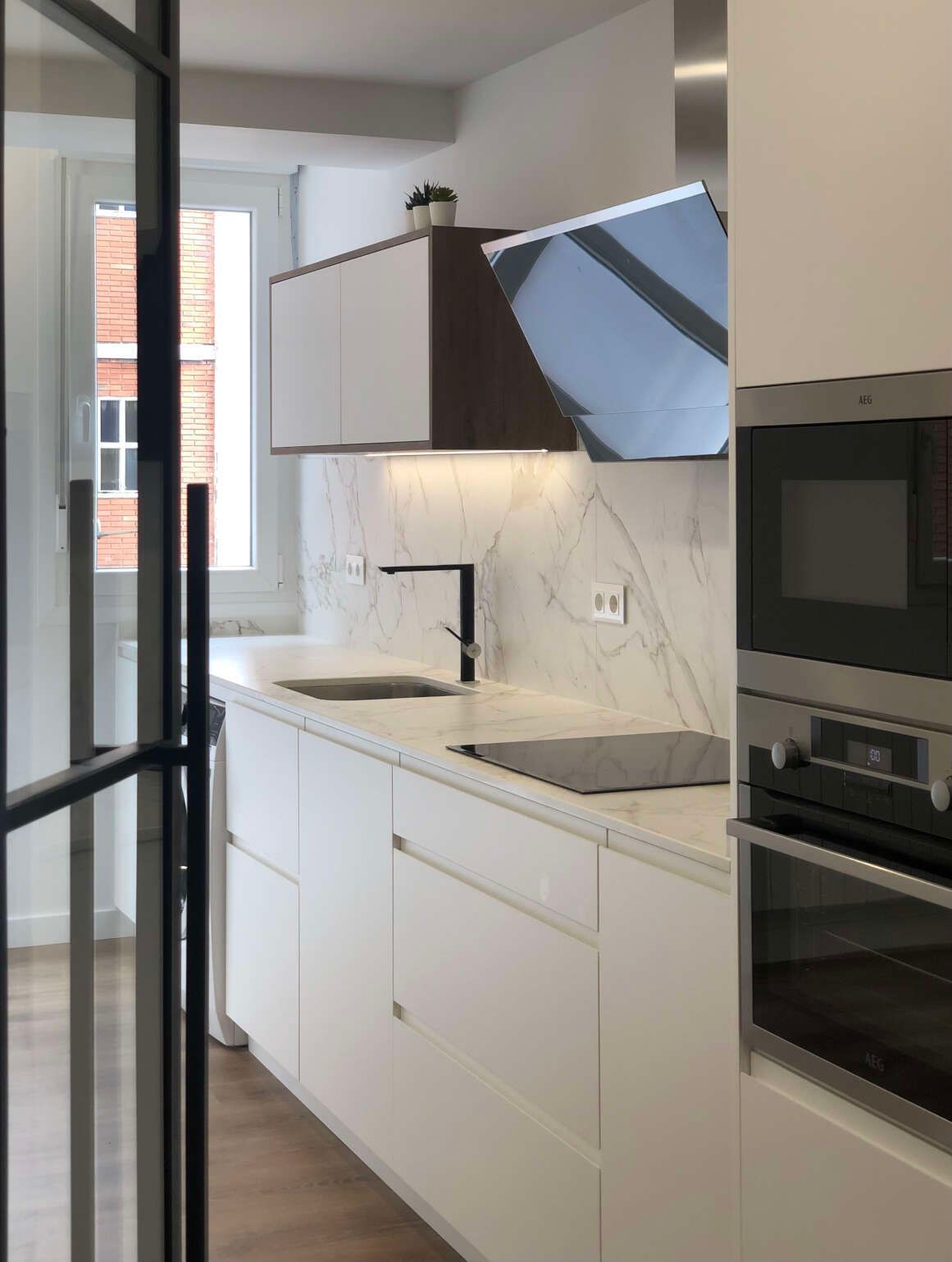 El mayor reto en la reforma de esta vivienda fue dotar de la luz necesaria a cada estancia. Para ello, integramos la terraza en dos de los espacios más importantes, el dormitorio principal y la cocina, ganando amplitud y luminosidad.