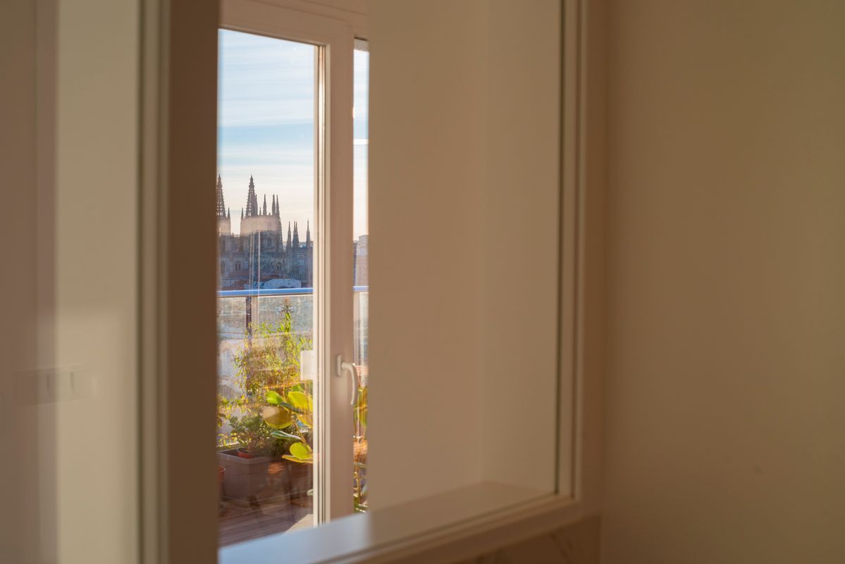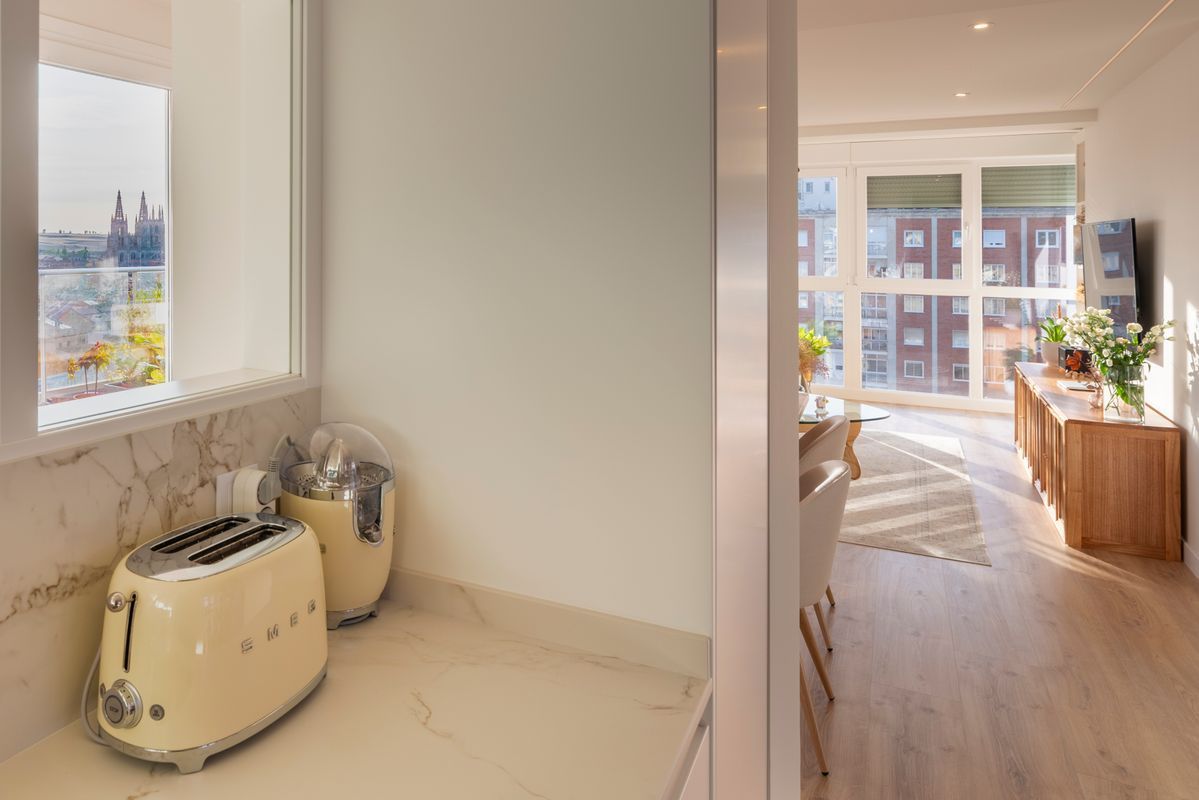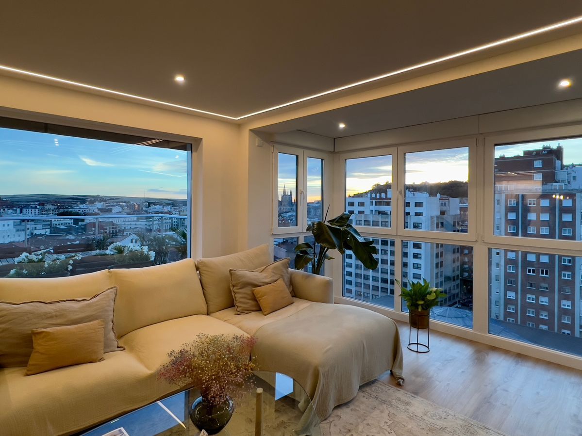 Desde el primer momento en el que entras en casa tienes la sensación de que estás flotando sobre el cielo ya que toda la fachada es una galería de suelo a techo y debido a la altura a la que ésta se encuentra y lo bajos que quedan el resto de edificios del Casco Histórico de Burgos.