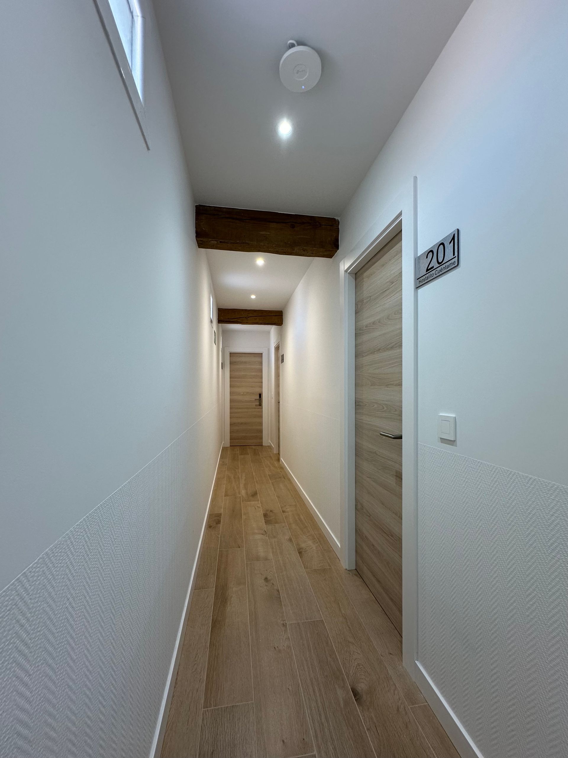 El resultado final es un hostal de siete habitaciones, cada una de ellas con baño incorporado, que preserva el alma del antiguo molino, reinterpretándolo desde una mirada contemporánea. Los elementos originales del edificio —su estructura, texturas y huellas del paso del tiempo— conviven de manera equilibrada con una arquitectura sobria y actual, donde cada intervención se ha planteado con precisión y respeto. Los espacios resultantes conservan la autenticidad del inmueble histórico, al tiempo que incorporan soluciones funcionales y confortables que responden a las necesidades del usuario actual.