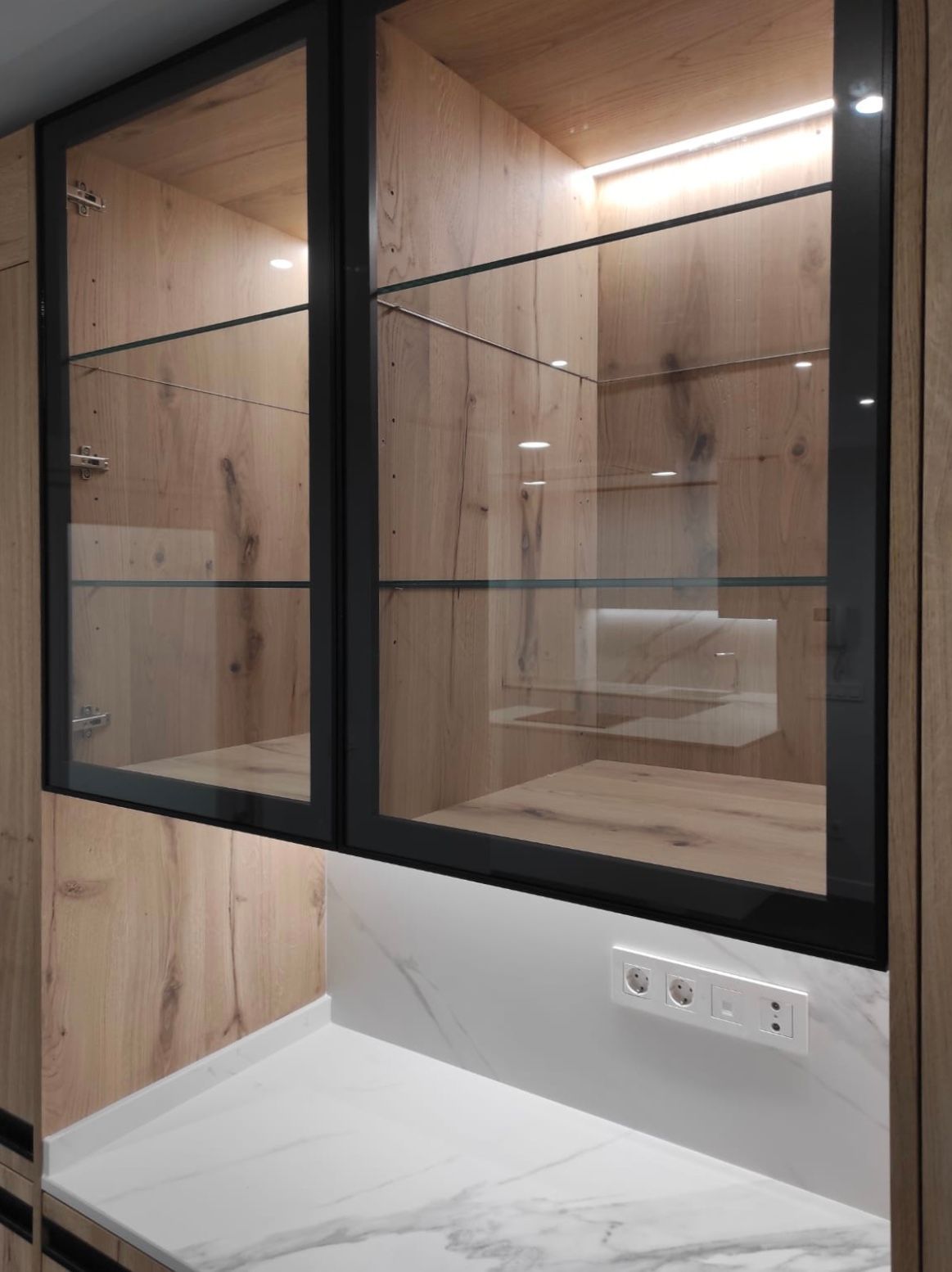 La reubicación, conservación y restauración de los antiguos muebles de madera existentes en la vivienda unen lo moderno con lo clásico, gracias al magnífico y detallista trabajo de carpintería realizado en esta vivienda, al igual que el uso de numerosas luces indirectas en la decoración e iluminación.